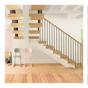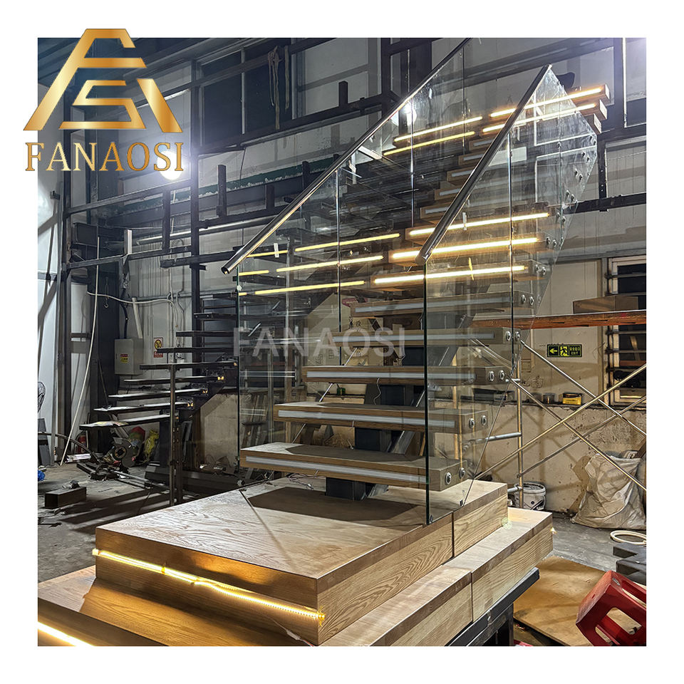 Indoor Straight Wood Tread Glass Railing Modern Floating Staircase/Prefab Led Light Wood Stair